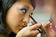 • Her eyeliner was a cream liner in graphite, which is a deep, dark gray and I set it with a shimmering dark burgundy.