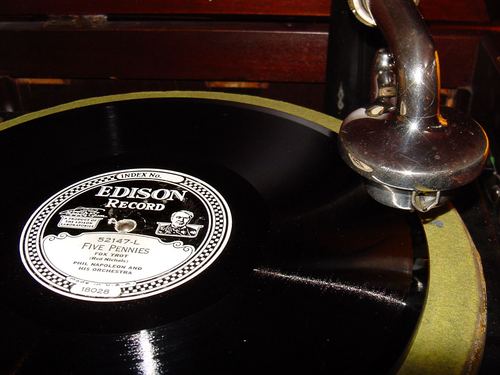 An early design 'phonograph record' on a record player. Source: http://en.wiktionary.org/wiki/File:DiamondDiscPhonograph.jpg