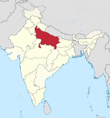 Source: http://en.wiktionary.org/wiki/File:Uttar_Pradesh_in_India_(disputed_hatched).svg