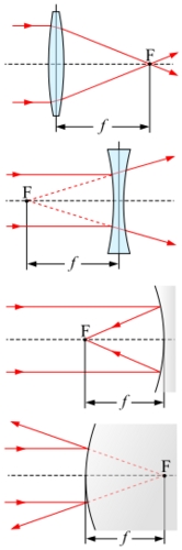 The focal point 'F' and focal length 'f' of a positive (convex) lens, a negative (concave) lens, a concave mirror, and a convex mirror. Source: http://en.wiktionary.org/wiki/File:Focal-length.svgAuthor: Henrik