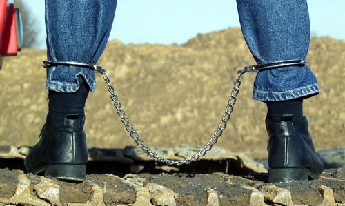 Fetters in use. Source: http://en.wiktionary.org/wiki/File:Fetters_-_leg_irons_-_photomodel_Ina.jpgAuthor: Raymond - Raimond Spekking
