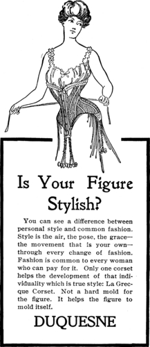An advertisement promising women to improve their figures. Source: http://en.wiktionary.org/wiki/File:Is_Your_Figure_Stylish.gif