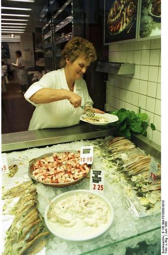 A fishmonger (person who sells fish) at work. Source: http://en.wiktionary.org/wiki/File:Bundesarchiv_B_145_Bild-F079080-0010,_Bonn,_Lebensmittelgeschäft.jpg