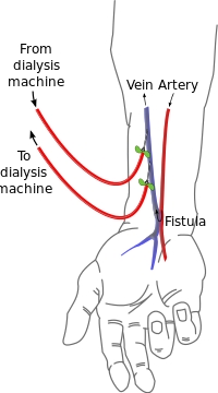 An artificially-created radiocephalic fistula. Source: http://en.wiktionary.org/wiki/File:Radiocephalic_fistula.svgAuthor: kbk (talk) Original uploader was Kbik at en.wikipedia