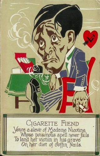 Source: eBay store Web page: http://cgi.ebay.com/1917-Penny-Dreadful-Postcard-Cigarette-Fiend_W0QQitemZ270315611645QQcmdZViewItemQQptZLH_DefaultDomain_0?hash=item270315611645&_trksid=p3911.c0.m14&_trkparms=72%3A1205%7C66%3A4%7C65%3A12%7C39%3A1%7C240%3A1318. http://en.wiktionary.org/wiki/File:PostcardCigaretteFiend1917.jpg