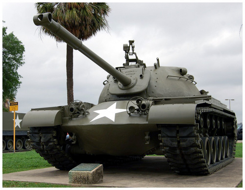 A [[tank. Source: Originally from en.wikipedia; description page is/was here. http://en.wiktionary.org/wiki/File:M48_Patton_Tank_on_display.jpgAuthor: Original uploader was Chitrapa at en.wikipedia