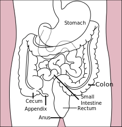 The intestine, along with surrounding organs. Source: US PD picture. http://en.wiktionary.org/wiki/File:Stomach_colon_rectum_diagram.svgAuthor: Indolences created it on the English Wikipedia.