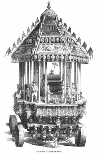 The Car of Juggernaut, as depicted in the 1851 'Illustrated London Reading Book'. Source: http://en.wiktionary.org/wiki/File:Juggernaut_-_Project_Gutenberg_eBook_11921.jpg