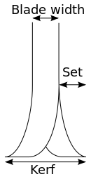 A schematic drawing of a saw blade looking head-on: the divergence between the teeth that protrude left-and-right is the 'kerf', it defines the width of the saw cut.