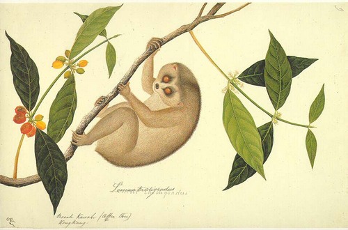 A 19th-century [[watercolour. Source: http://en.wiktionary.org/wiki/File:Lemur_tardigradus_(sic_–_Nycticebus_coucang);_Booah_Kawah_(Coffee_Tree)_(William_Farquhar_Collection,_1819–1823).jpg