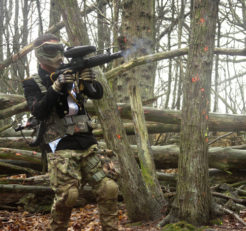 A man firing a paintball 'marker'. Source: http://en.wiktionary.org/wiki/File:Paintballmarker.jpgAuthor: BraNewbsClick to visit photographer's profile.