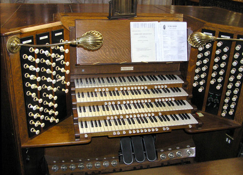 The console of a pipe organ (musical instrument). Source: http://en.wiktionary.org/wiki/File:Pipe.organ.console.arp.jpg