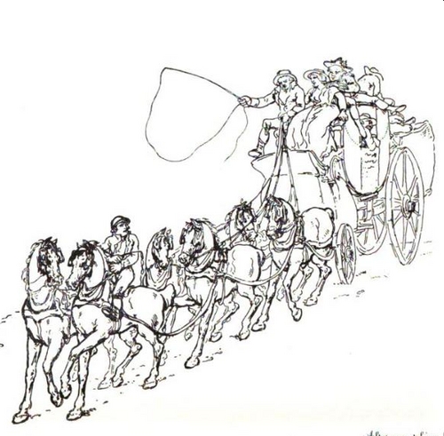 The man on one of the front horses is a 'postilion'. Source: http://en.wiktionary.org/wiki/File:Postilion.pngAuthor: 'Rowlandson'Click to visit photographer's profile.