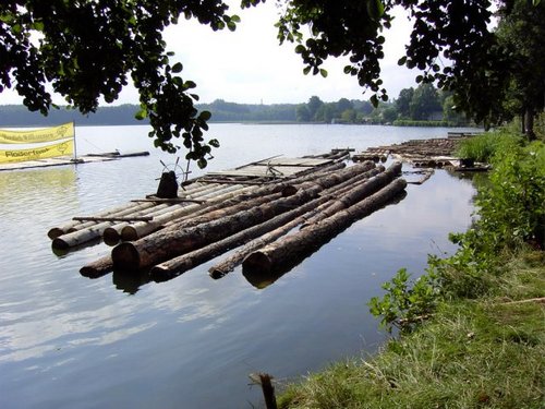 A wooden raft. Source: fotografiert im August 2004 beim Flößerfest. http://en.wiktionary.org/wiki/File:Floss.jpgAuthor: Vater von Oktaeder, upload from: [1]/[2] (10:53, 15. Aug 2004) . . Oktaeder (Diskussion) . . 640 x 4