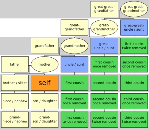 Kinship relations, showing degrees 'removed'. Source: svg version of Cousin tree.png. http://en.wiktionary.org/wiki/File:CousinTree.svgAuthor: Matt Leidholm (LinkTiger)