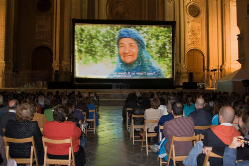 Inflatable screen (AIRSCREEN) in [[Granada. Source: http://en.wiktionary.org/wiki/File:Cinesdelsur_pantalla_abierta.jpgAuthor: Carmen OfuassiaClick to visit photographer's profile.
