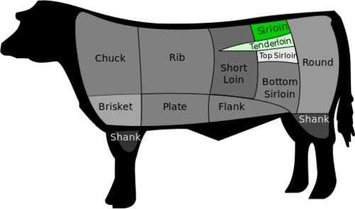 'sirloin' in a cow, above the loin. Source: Transferred from en.wikipedia; transferred to Commons by Nils R. Barth using CommonsHelper. http://en.wiktionary.org/wiki/File:BeefCutSirloin.svgAuthor: Original uploader was Yzmo at en.wikipedia