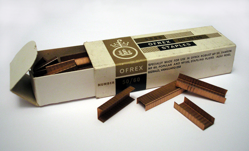 A box of staples. Source: http://en.wiktionary.org/wiki/File:Copper_Staples_No_50,60.JPGAuthor: “Keith S Brown (Ksbrown)”