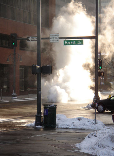 Steam rising from the street grates. (1, 2). Source: morning cold. http://en.wiktionary.org/wiki/File:Steam_denver_market_street.jpgAuthor: Robby! from Denver, USA