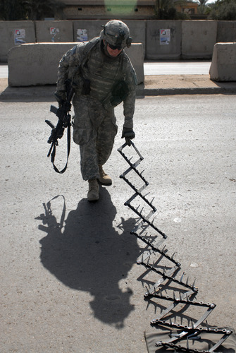 A US Army soldier deploying a 'stinger' at a vehicle check point in Iraq.