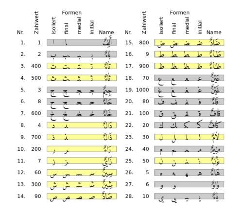 A table (3) of characters in the Arabic alphabet. Source: http://en.wiktionary.org/wiki/File:Arabischesalphabet.svg