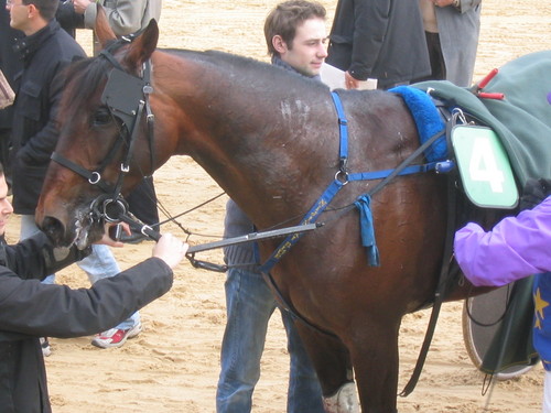 A blinkered horse. Source: http://en.wiktionary.org/wiki/File:Oeillères_carrées_Pivotantes.JPGAuthor: historicair