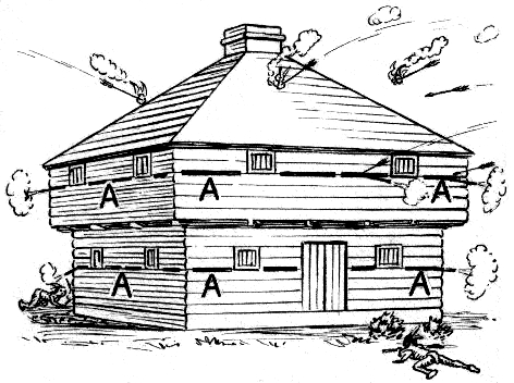 A wooden fortification with a projecting upper story. Source: Image:Blockhouse (PSF).jpg. http://en.wiktionary.org/wiki/File:Blockhouse_(PSF).pngAuthor: Sopoforic