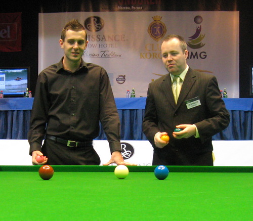 Two people, and a snooker table with three balls on it: a brown, a white and a blue. Source: http://en.wiktionary.org/wiki/File:WSoS_2008_Moscow-209.jpgAuthor: Владимир СиницынClick to visit photographer's profile.