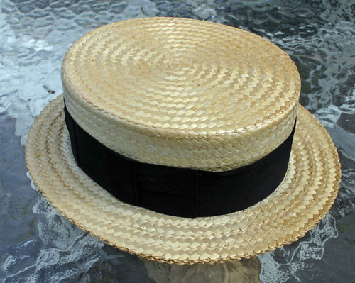 A boater (straw hat). Source: Originally uploaded to Wikipedia, here. http://en.wiktionary.org/wiki/File:BoaterStrawHat_wb.jpgAuthor: Elf