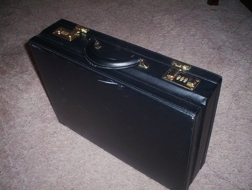 A black briefcase. Source: w:en:Image:Briefcase.jpg. http://en.wiktionary.org/wiki/File:Briefcase-photo.jpgAuthor: w:en:User:Dev920