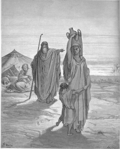 Abraham Sends Hagar and Ishmael Away (Gen. 21:1-14). Source: http://en.wiktionary.org/wiki/File:014.Abraham_Sends_Hagar_and_Ishmael_Away.jpg