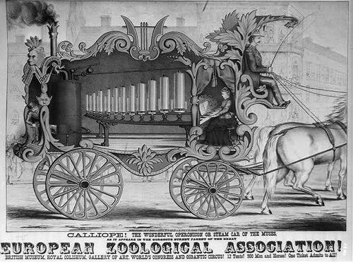 A calliope mounted in a wagon. Source: http://en.wiktionary.org/wiki/File:Calliope_(music)_wagon_for_European_Zoological_Association.jpg