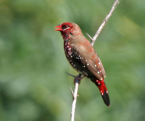 A red 'avadavat', 'Amandava amandava'. Source: http://en.wiktionary.org/wiki/File:Red_Avadavat_(Amandava_amandava)_W_IMG_4411.jpgAuthor: J.M.Garg