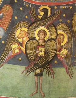 A cherub, as described by Ezekiel. Source: http://en.wiktionary.org/wiki/File:Tetramorph_meteora.jpgAuthor: UnknownClick to visit photographer's profile.