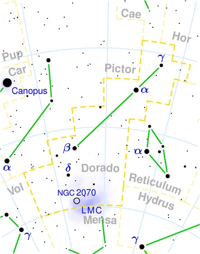 A map of Dorado; the area marked LMC is the Large Magellanic Cloud. Source: http://en.wiktionary.org/wiki/File:Dorado_constellation_map.png