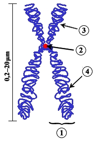 An illustration of chromosome, with its parts. (1) Chromatid. One of the two identical parts of the chromosome after S phase. (2) Centromere. The point where the two chromatids touch, and where the microtubules attach. (3) Short arm (4) Long arm.