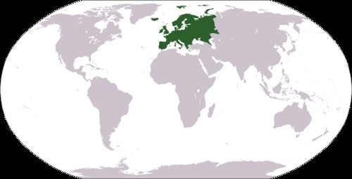 World map showing the location of Europe (continent). Source: - map adapted from PDF world map at CIA World Fact Book. http://en.wiktionary.org/wiki/File:LocationEurope.pngAuthor: user:Cumhur