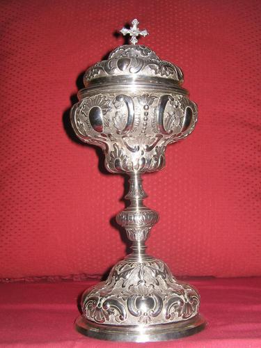 A ciborium (receptacle). Source: Igesia de san Pedro de Ayerbe 'Exposición permanente de arte religioso'. http://en.wiktionary.org/wiki/File:2006.10_Copón.jpgAuthor: Unknown