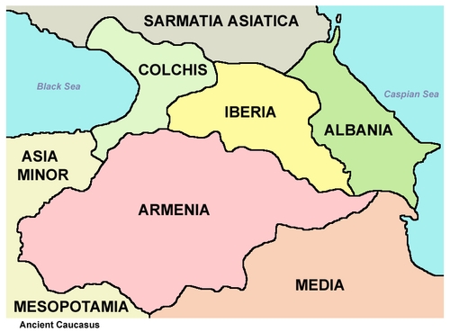 Source: 'Armenia, Colchis, Iberia, Albania &c.' by Lea & Blanchard, c. 1830. (Web page from which the source map was taken is no longer available. Other web pages where other versions of this map could be found are here: [1], [2], [3]). http://en.wiktionary.org/wiki/File:Caucasus03.png