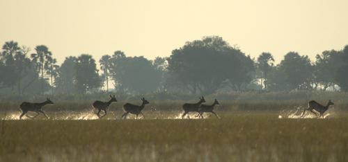 'lechwe' on the run. Source: Transferred from en.wikipedia. http://en.wiktionary.org/wiki/File:Fast-running-group-of-Lechwe.jpgAuthor: Original uploader was PanBK at en.wikipedia