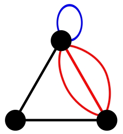 A multigraph with a loop (blue) and three edges with the same endpoints (all red). Not all authors allow multigraphs to have loops. Source: http://en.wiktionary.org/wiki/File:Multigraph.svgAuthor: Arthena