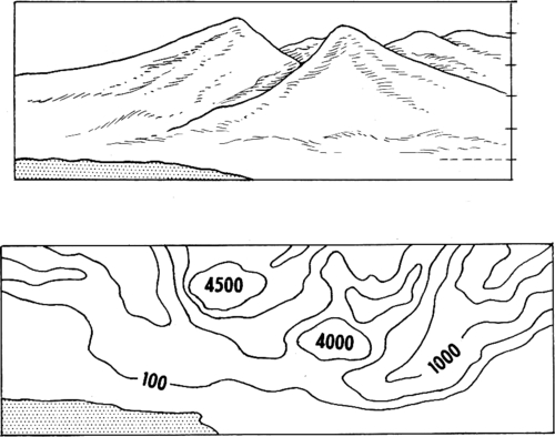 The picture in the lower half shows the contours of elevation of the mountains above. The points on a single curve are at same elevation. Different lines may be at different elevation whose value is given in between the lines.