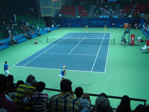Professional tennis players playing on a tennis 'court' (def. 12) in New Delhi, India. Source: http://en.wiktionary.org/wiki/File:RK_Khanna_Tennis_Complex_New_Delhi_-_Centre_Court_at_Night.jpgAuthor: Vssun