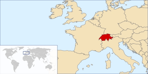 Switzerland's location. Source: Original by User:Vardion, Image:A large blank world map with oceans marked in blue.svg. http://en.wiktionary.org/wiki/File:LocationSwitzerland.svgAuthor: User:Rei-artur