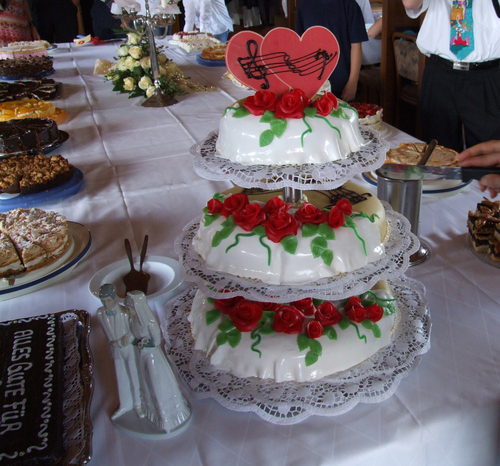 A traditional Western-style wedding cake at a celebration in [[Germany. Source: http://en.wiktionary.org/wiki/File:Hochzeitstorte.jpgAuthor: Claus Ableiter